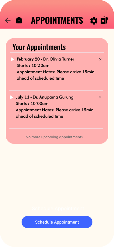 For this project, I completed all of the work myself, drawing heavily from my personal experience as a long term patient who regularly receives infusions. I also conducted research on individuals living with chronic health conditions to better understand common needs and behaviors. I began by designing a logo from scratch, using Pinterest for inspiration and asking friends what visuals came to mind when they thought of hospitals. After exploring common color schemes in health apps, I selected a pink and orange ombre palette that complemented the logo and reflected warmth and care. I created digital rough sketches of my design ideas and documented the features I wanted the app to include. From there, I developed sketches for mobile, tablet, desktop, and watch versions. I used Figma to start prototyping the app, with most of my time focused on designing the main layout and user interface components like tabs and icons. This was the most difficult phase for me, as I often second guessed my decisions and revised my work repeatedly. I spent extra time on the home page since it is the first impression users will have of the app. For the remaining pages, I took a more intuitive approach, referencing other health app interfaces to ensure consistency with familiar design standards. Each phase took several hours over multiple days, with layout design and homepage development taking the longest due to the many revisions I made.